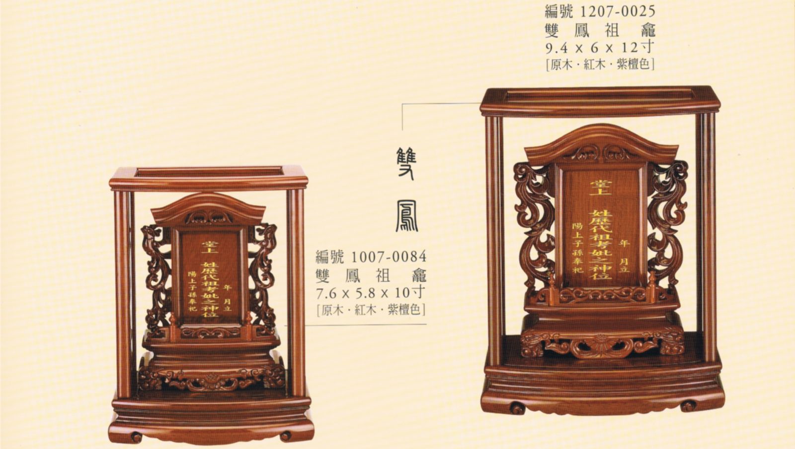 首頁 » 商品資訊 » 4.祖先牌位 » 4.花梨木 » 花梨木雙鳳祖龕A51007